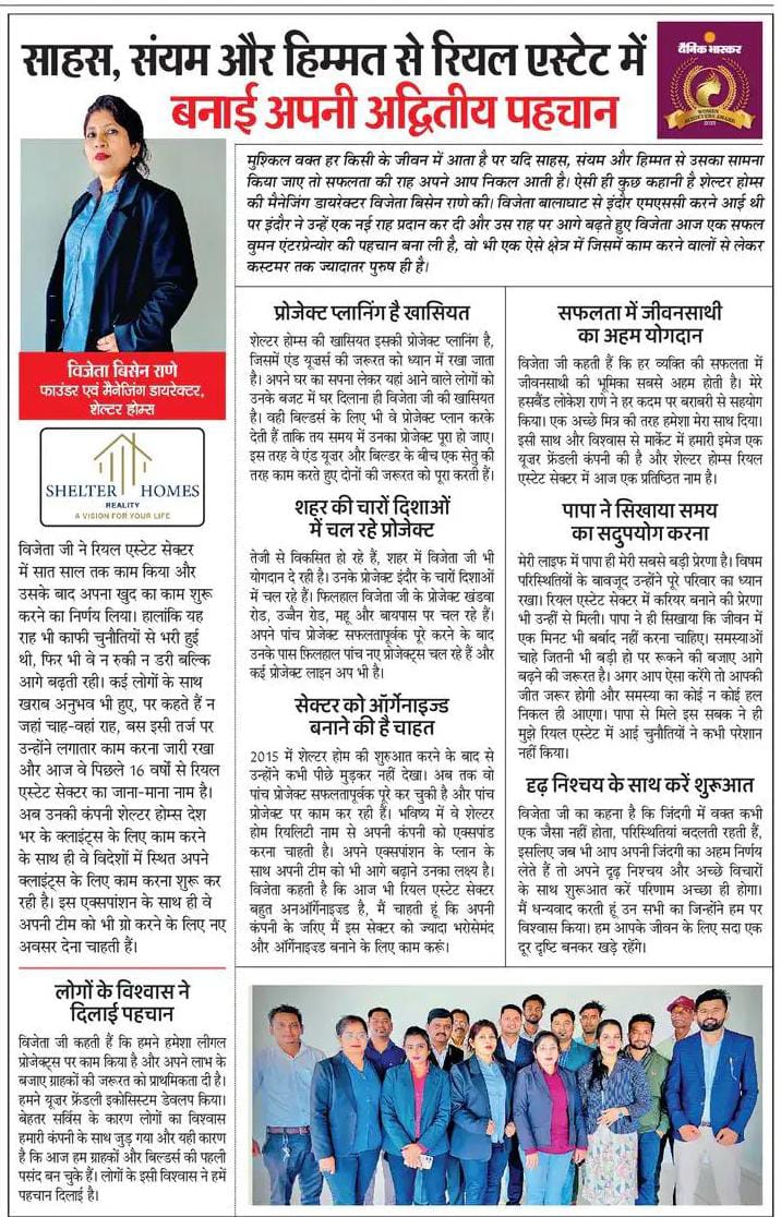 I had a great experience with shelter homes. Their team was professional, knowledgeable, and responsive throughout the entire process. Whether you're looking for plot,a house and a flat, they have a wide range of options to choose from. They made the whole experience seamless and stress-free. I would highly recommend their services to anyone in the Indore area.They have good code of ethics.Their connections are really good and are really helpful and humble.